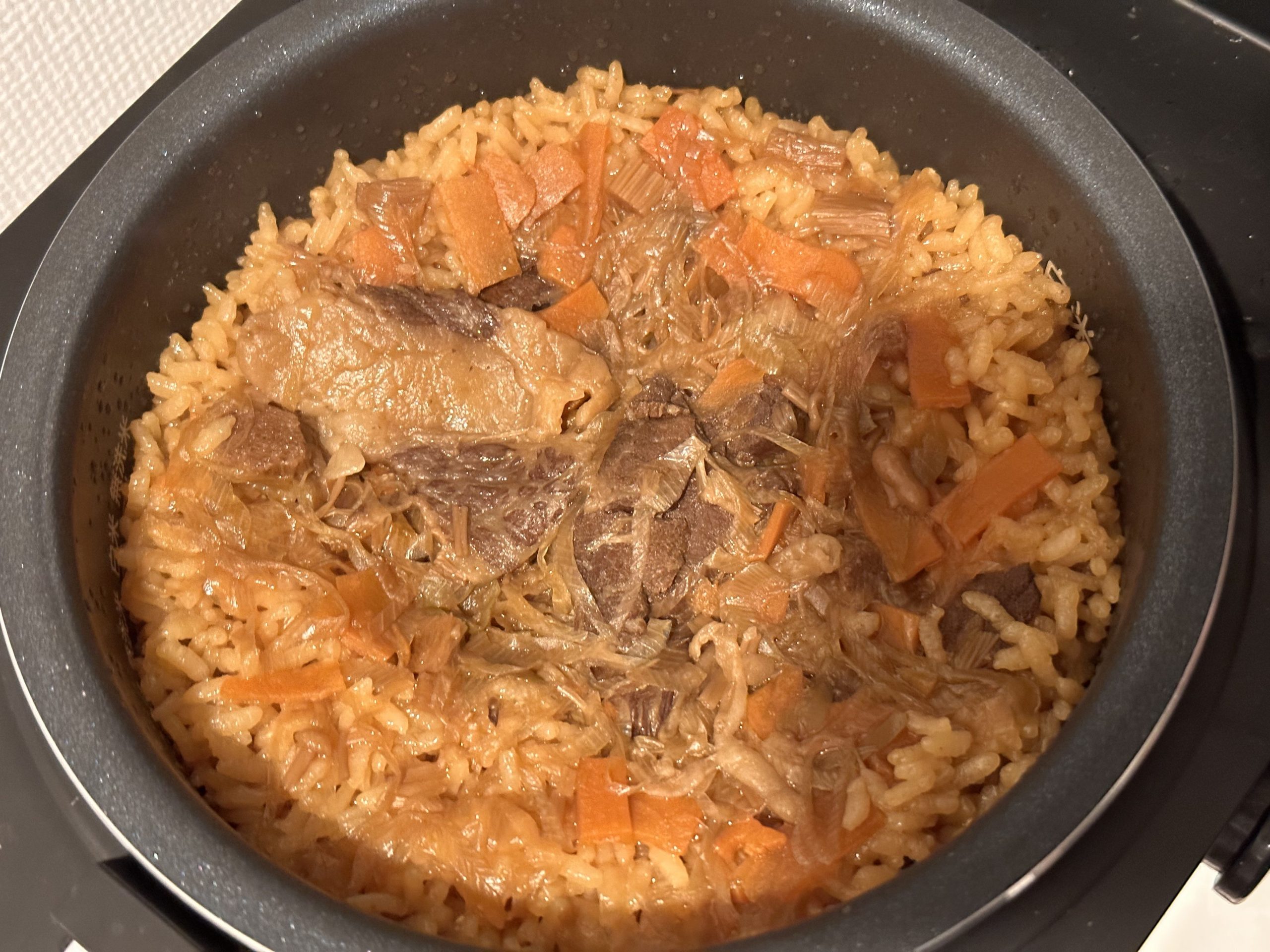 美味しそう…。しかもそう!お肉がしっかりと入ってるんです!霜ふってる!炊いてる途中も、高いお肉、特に松坂牛で強いなんとも食欲をそそる甘い肉の香りがしてきて…!